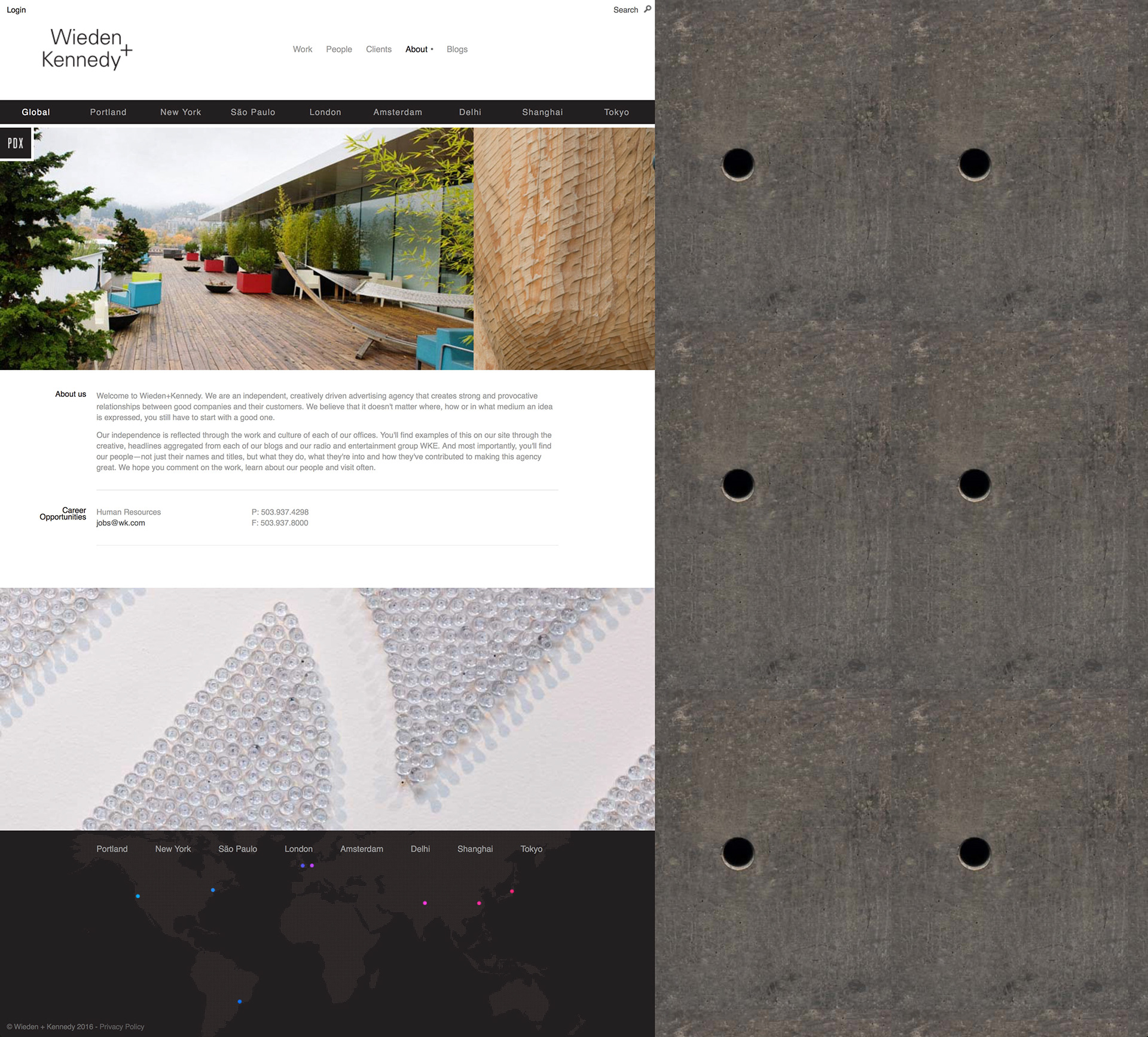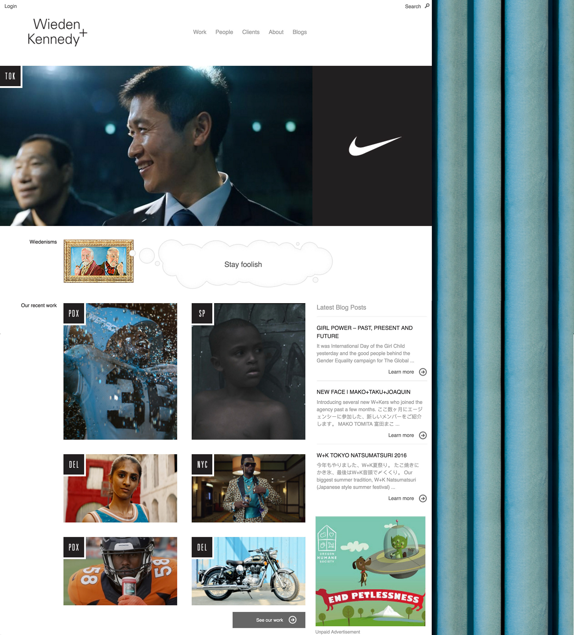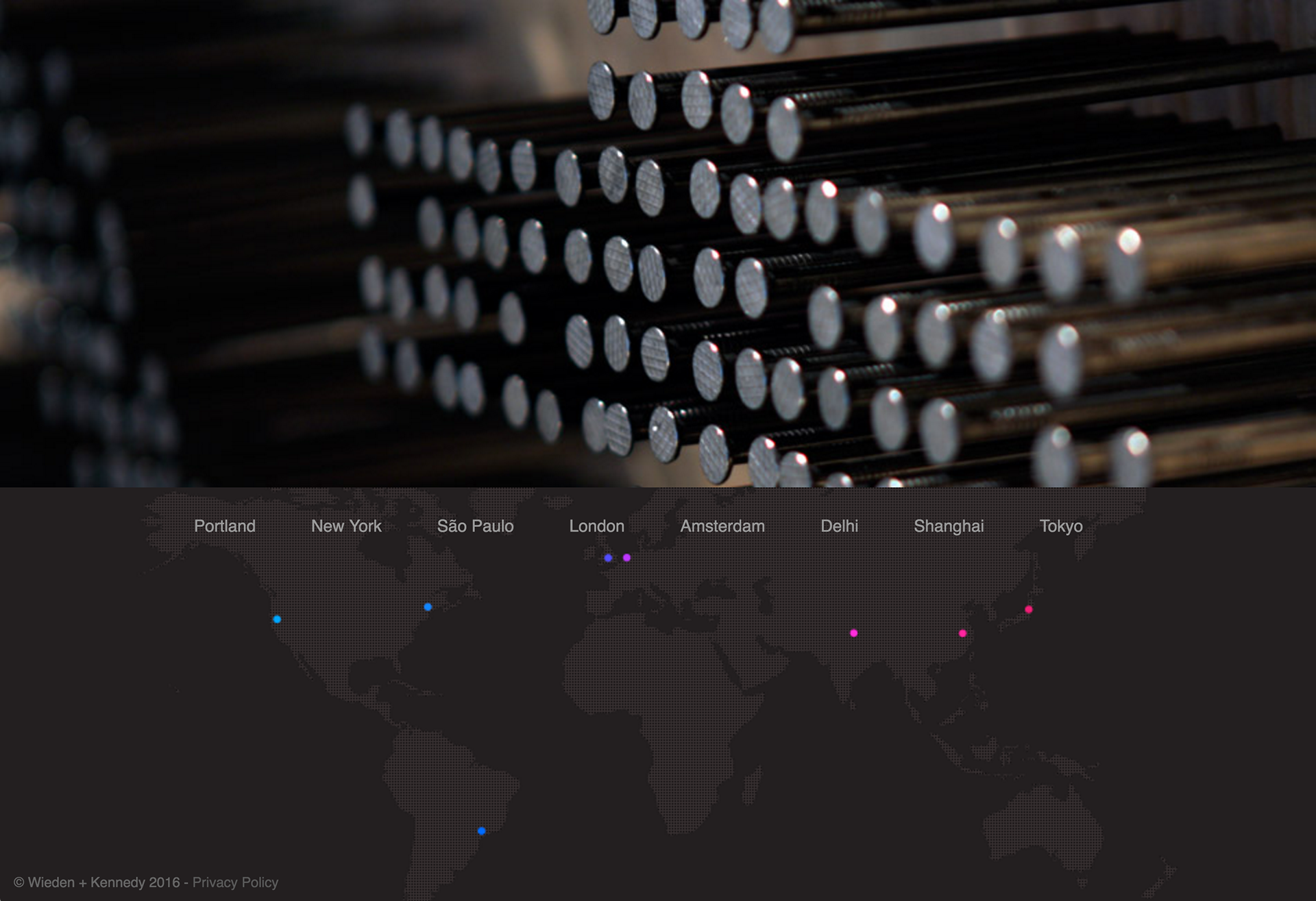 I was so damn lucky to be given with the opportunity to walk through the tall metal doors of W+K the day after graduation. Little did I know that I would also be given the greatest gift of all, the challenge of redesigning Wieden + Kennedy's global website. This two year endeavor became one of my most challenging websites of all time. They say that building a personal portfolio is one of the toughest tasks for one to pursue. Now multiply that seven times for each office around the world. It was a truly a once in a lifetime chance to worked directly with the most creative minds in the world.